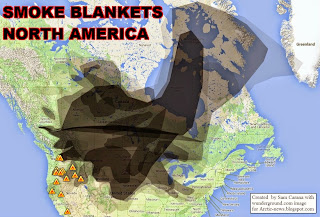 It's not just Canada. Over at the Weather Underground, Jeff Masters and his crew have posted a video showing a blackened haze pouring from numerous fires in hot, drought-striken western states all the way to the Great lakes, into Ohio. According to a NASA map released July 18th, the smoke has even reached Maryland, West Virginia, and Tennessee. All this is a danger to people's health, especially to the millions of new cases of asthma springing up across America, and around the world.