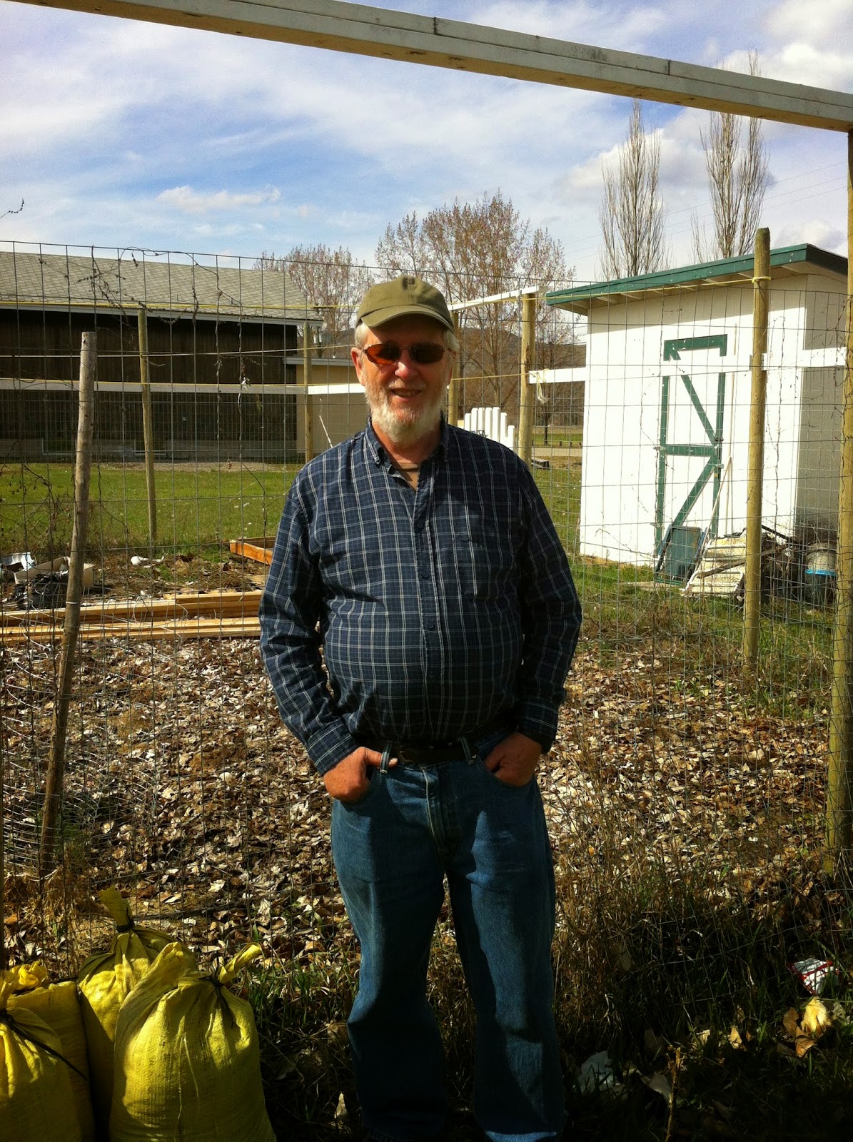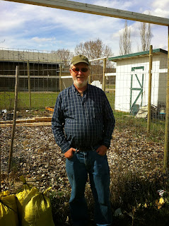 Alex Smith, by his winter garden (tucked in with leaves as ground cover). Note 7 foot deer fence and home made garden shed.